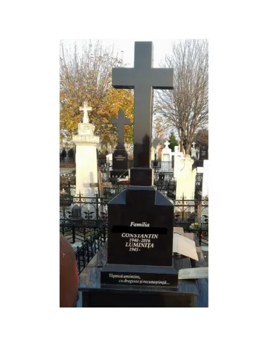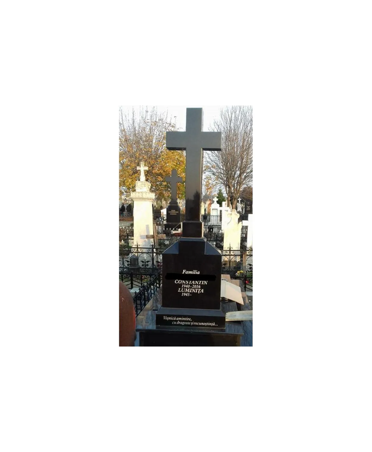 Crucea este simbol al creştinătăţii, al credinţei şi al vieţii veşnice. În tradiţia ortodoxă, crucea din piatră face transcendența între cele două lumi, cea pământească și cea divină. Modelul monument funerar granit GG0012, realizat din cruce de granit, soclu şi postament vă permite să omagiaţi, cu onoare, memoria defunctului trecut în nefiinţă. Prezența acestuia contribuie la desăvârşirea unui ambient sobru, potrivit pentru rugăciune, reculegere şi comemorare. Crucea realizată din granit de înaltă calitate, pare să se înalţe către cer asemeni unei coloane a infinitului. Soclul este solid, asigurând poziţionare corectă și de durată a monumentului. De asemenea este prevăzut cu spaţiu generos pentru inscripţionarea mesajelor de adio. Postamentul vine cu design simplist şi întregeşte întreaga creaţie.