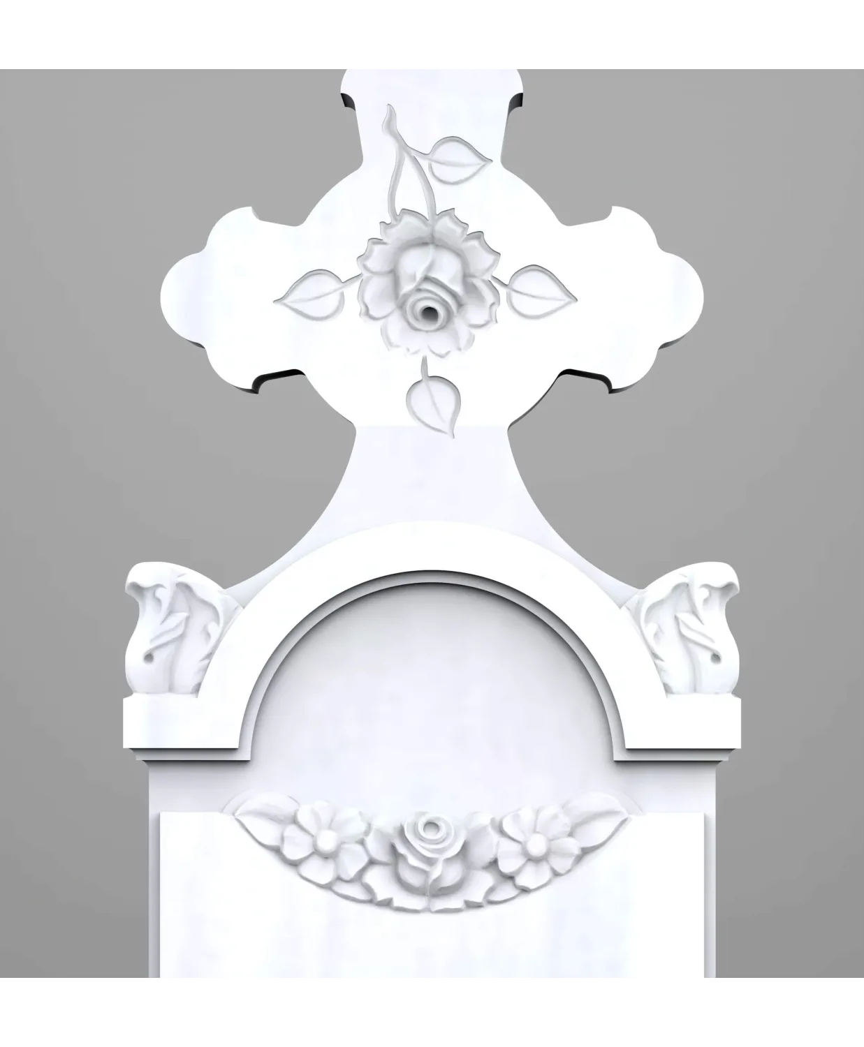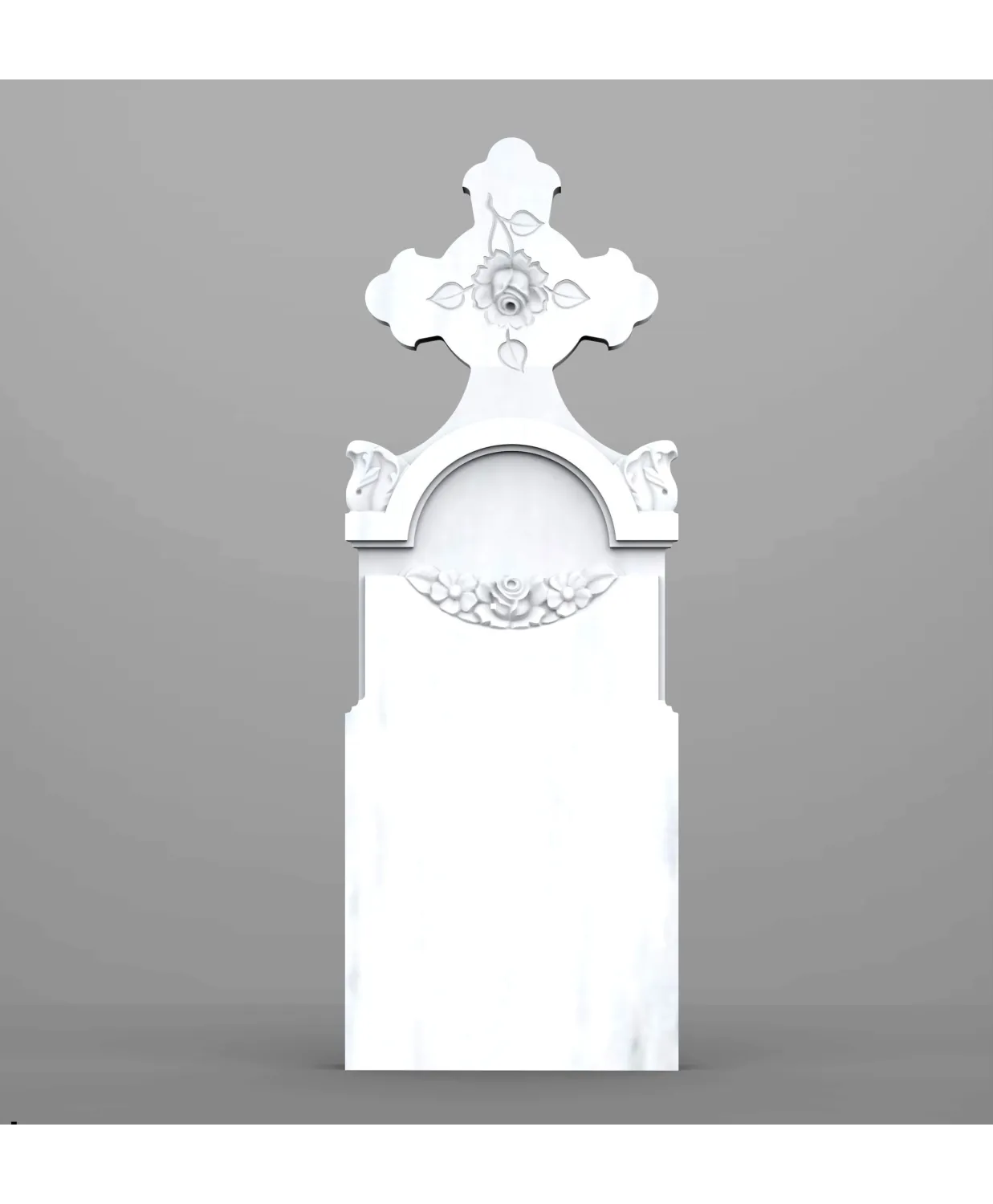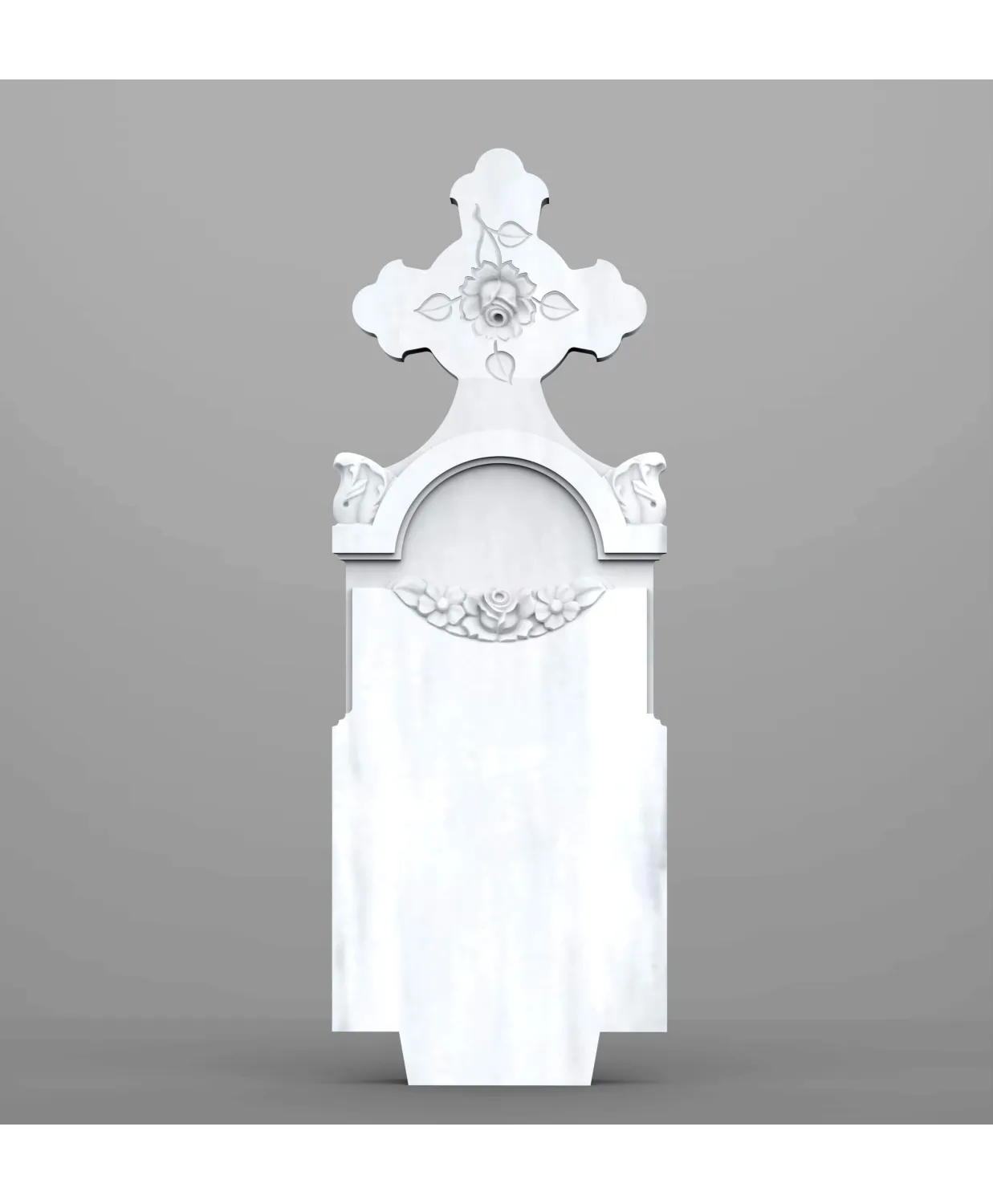 Monument funerar din marmura model M2000, disponibil pe mai multe dimensiuni. Produlul prezinta 4 sculpturi in basorelief- 2 umeri , coronita si trandafir.