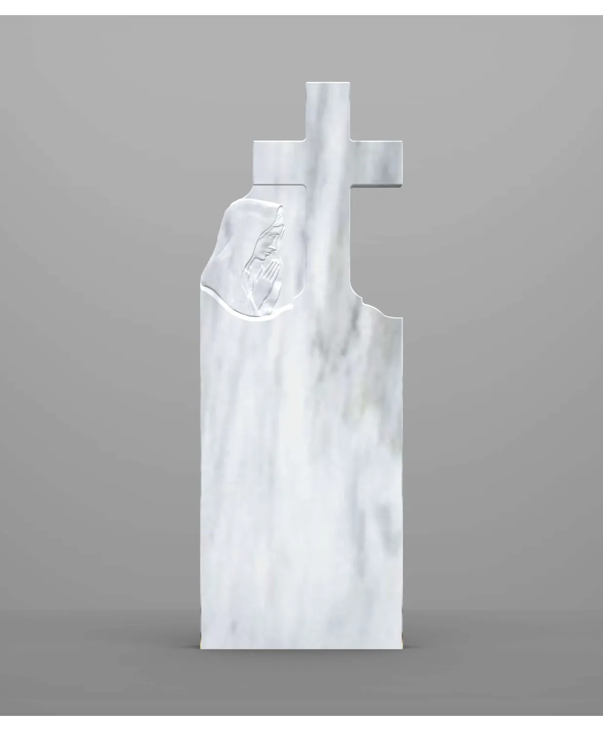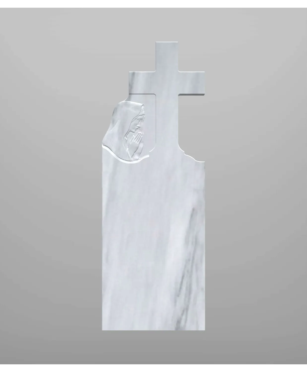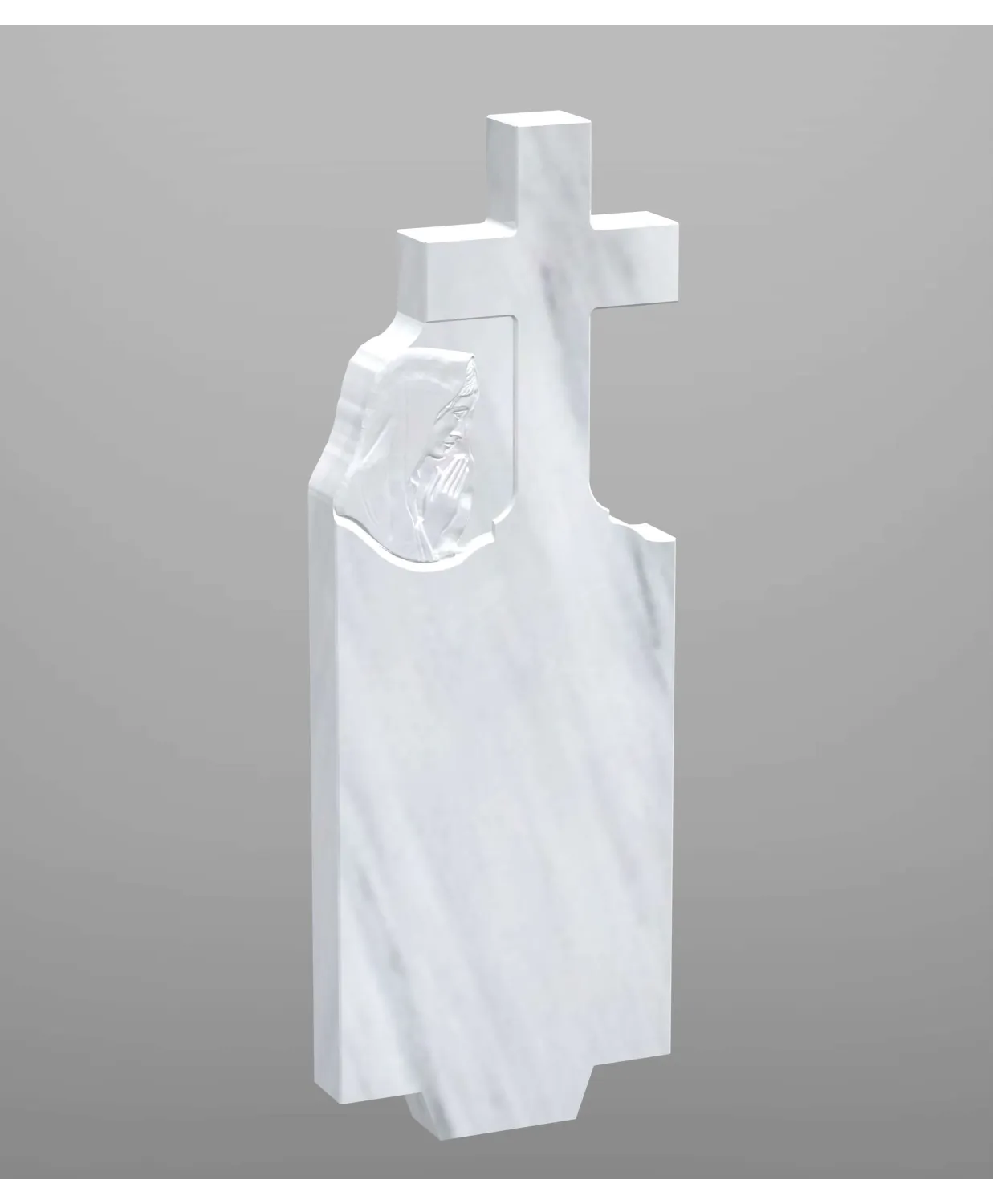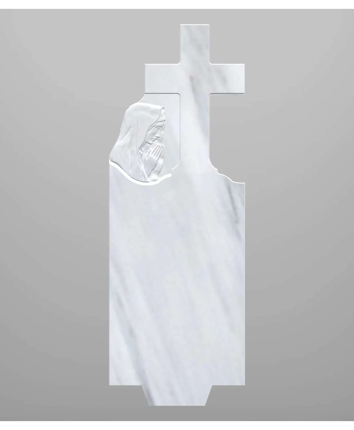 În partea inferioară, blocul este compact și asigură stabilitate. Partea superioară este elegantă, în dreaptă sub braţul crucii este gravată imaginea Maica Domnului aflată în poziţie de rugăciune. Crucea are aspect minimalist ce accentuează eleganța obiectului funerar.