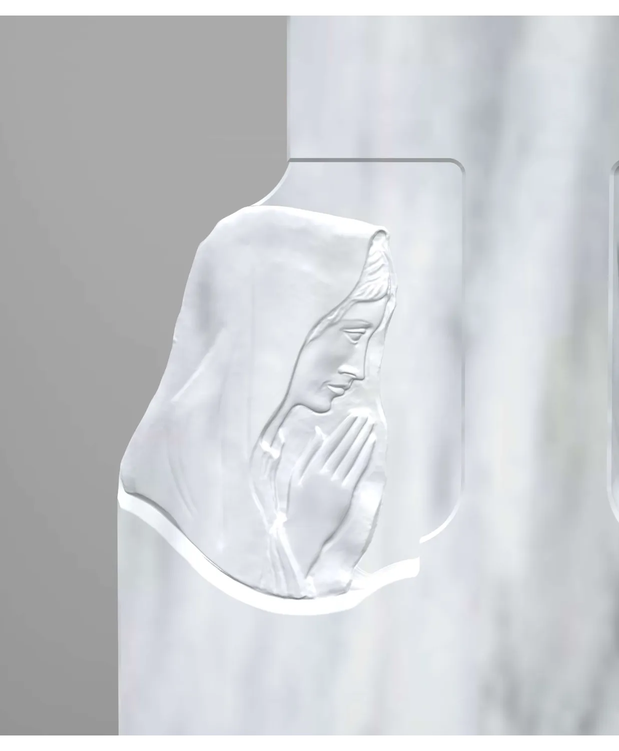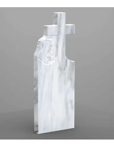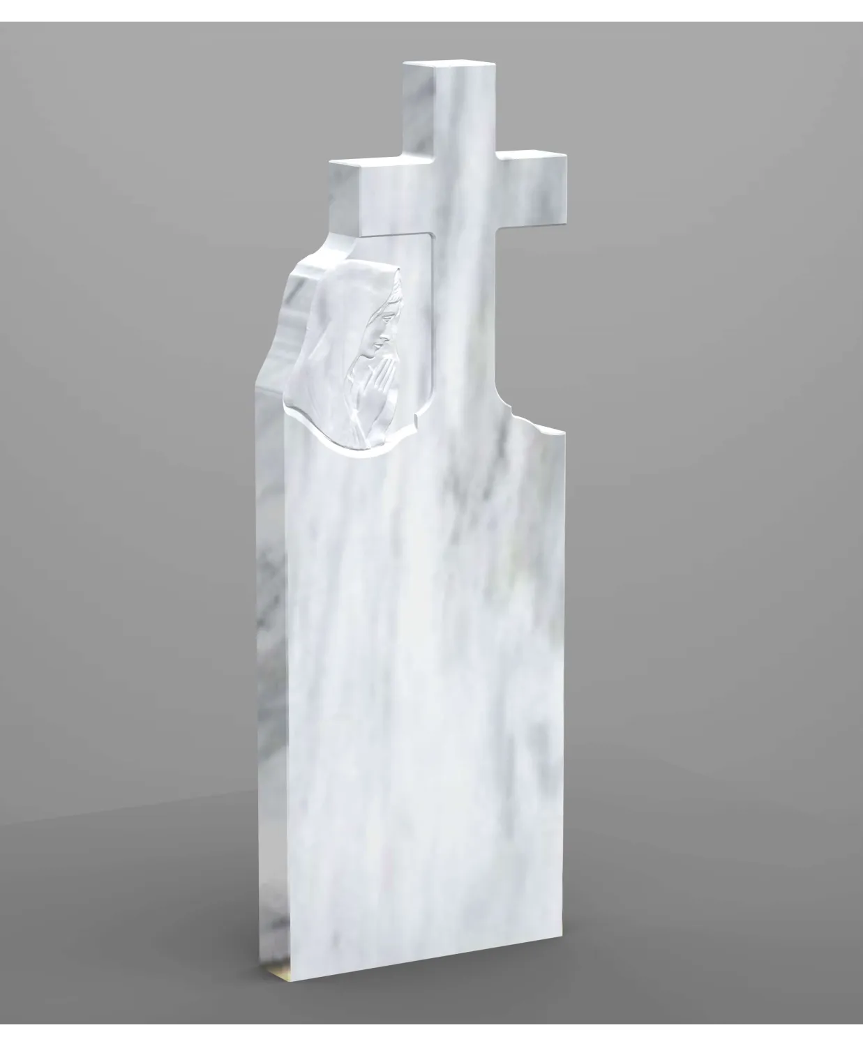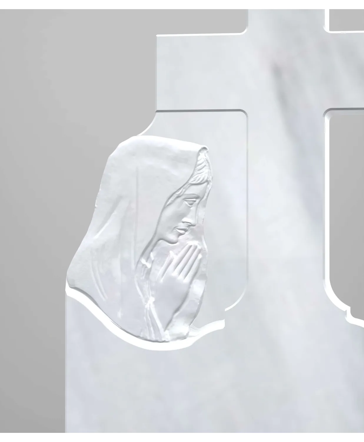 În partea inferioară, blocul este compact și asigură stabilitate. Partea superioară este elegantă, în dreaptă sub braţul crucii este gravată imaginea Maica Domnului aflată în poziţie de rugăciune. Crucea are aspect minimalist ce accentuează eleganța obiectului funerar.