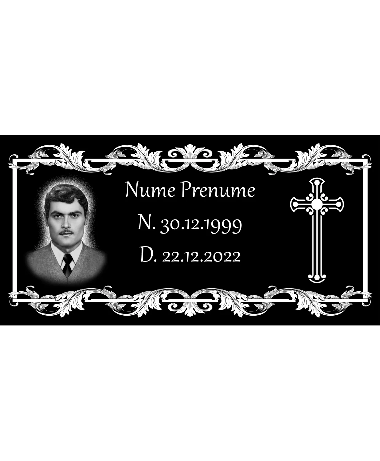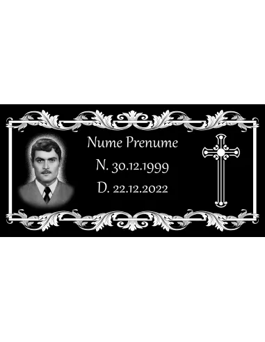 Placă comemorativa inscripționată și cu fotogravură adăugată, placa este pentru o singură persoană.Pentru clienții pretențiosi exista si varianta premium, unde editarea pozei se va face de catre un artist profesionist care va putea scoate si mai mult in evidență chipul persoanei dragi.