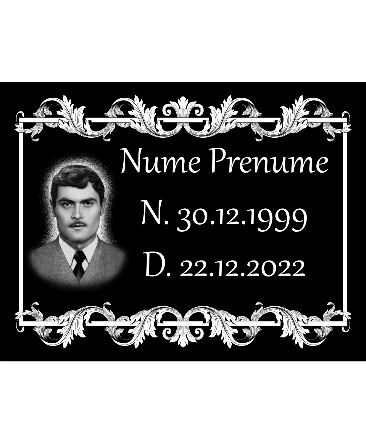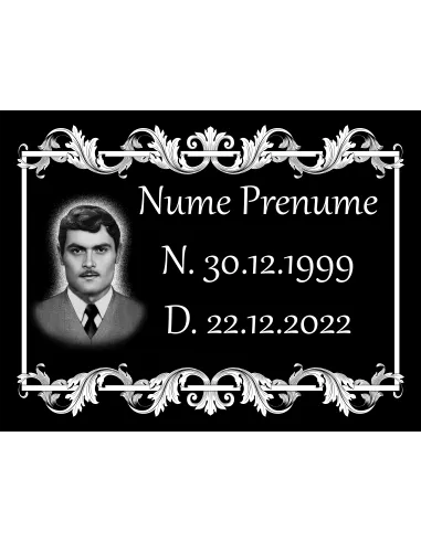 Placă comemorativa inscripționată și cu fotogravură adăugată, placa este pentru o singură persoană.Pentru clienții pretențiosi exista si varianta premium, unde editarea pozei se va face de catre un artist profesionist care va putea scoate si mai mult in evidență chipul persoanei dragi.