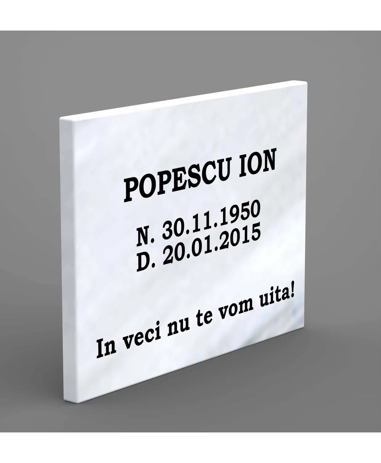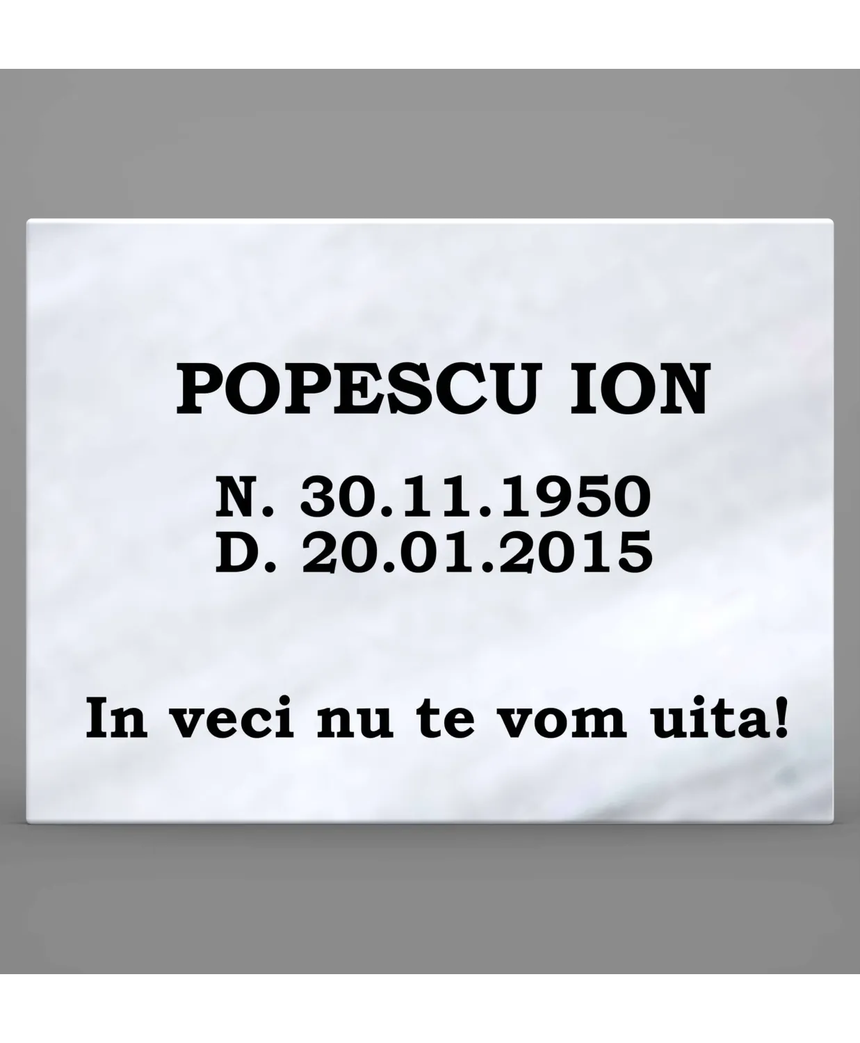 Placa comemorativa din marmura, grosime 2 CM si dimensiune 30x40 CM, personalizabila in functie de dorintele clientului. Placa poate fi asezata vertical sau orizontal in functie de necesitati, poate fi livrata cu gauri pentru montaj, recomandam 2 gauri pentru prindere, totusi pentru siguranta dumneavoastra putem livra produsul cu 4 gauri, desi nu este cazul.